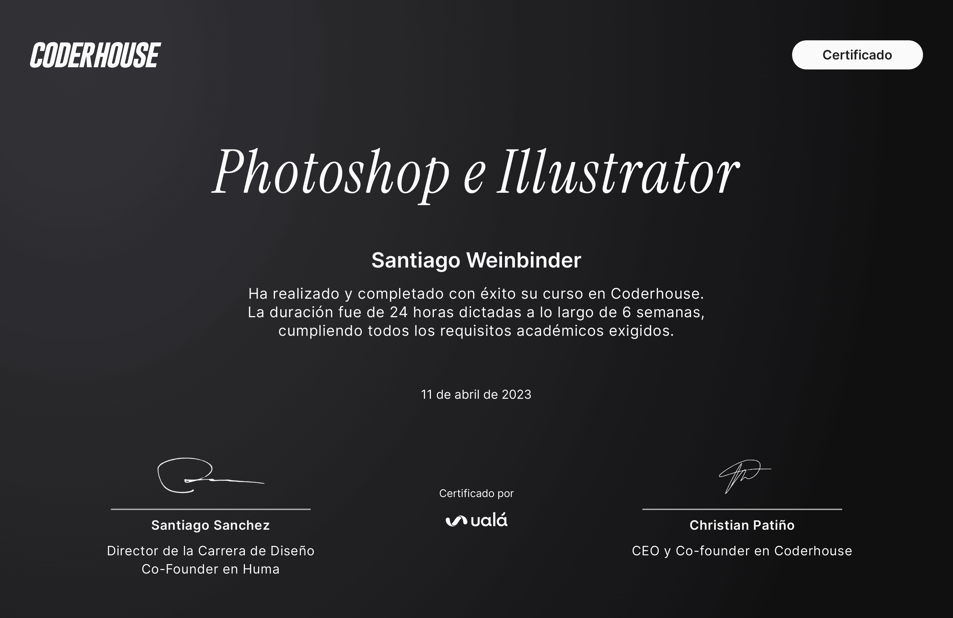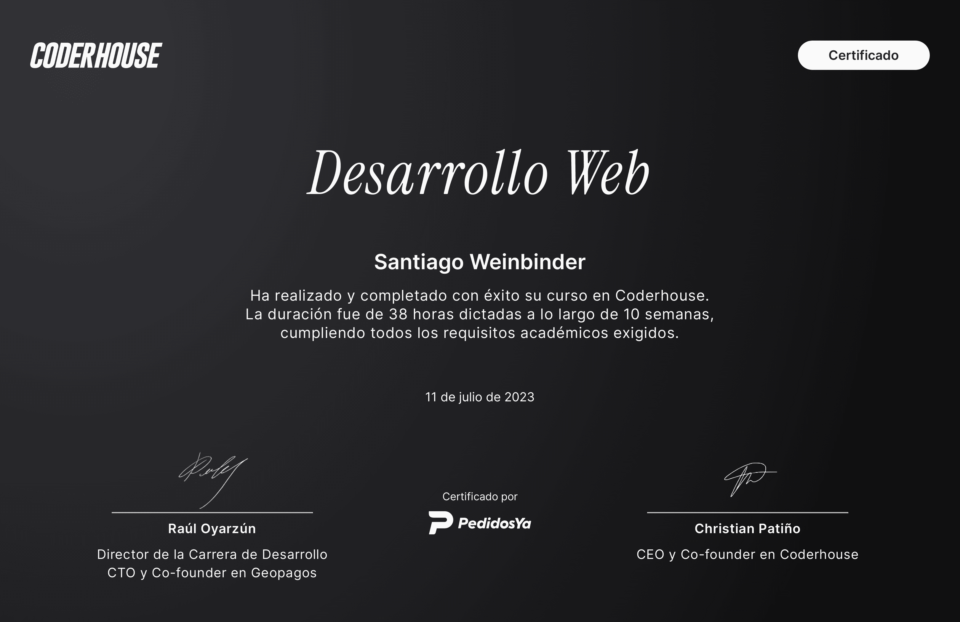 Asistencia 100%, desafíos 100%, nota final 10. Certificado