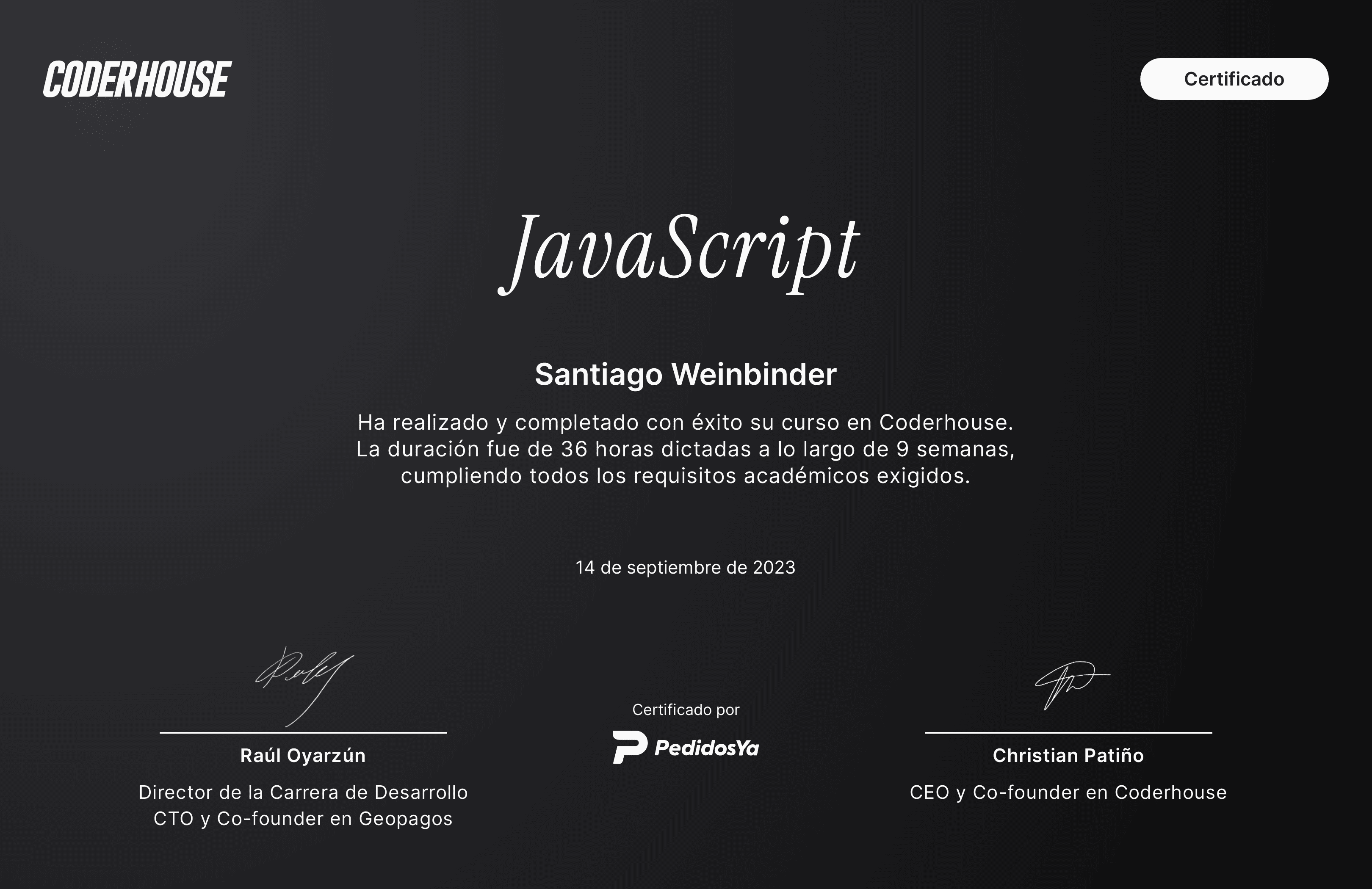 Asistencia 95%, desafíos 100%, nota final 9. Certificado